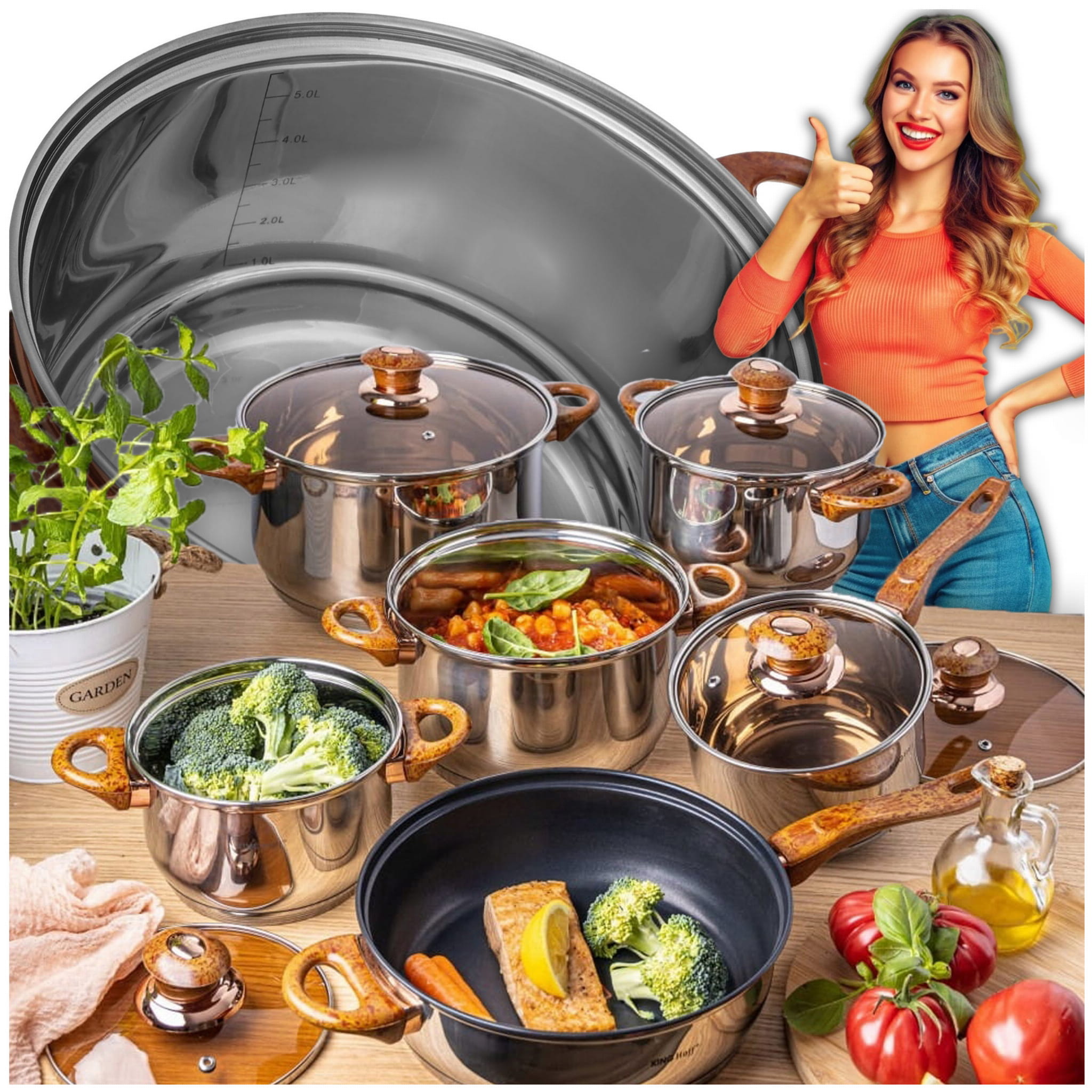 12-teilig Edelstahl Topfset mit Deckel 2.1L bis 6.5L und Teflon Pfanne von KINGHOFF