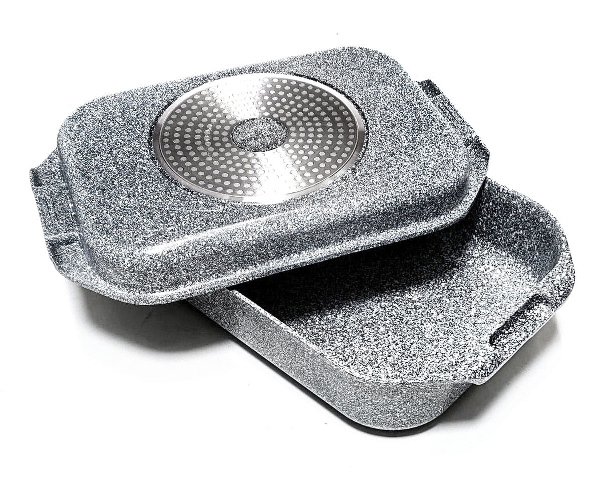 Zweiteilig und doppelseitig. Es besteht aus einer tiefen Bratpfanne und einer Bratpfanne / Patties zum Grillen, die gleichzeitig als Deckel dient.