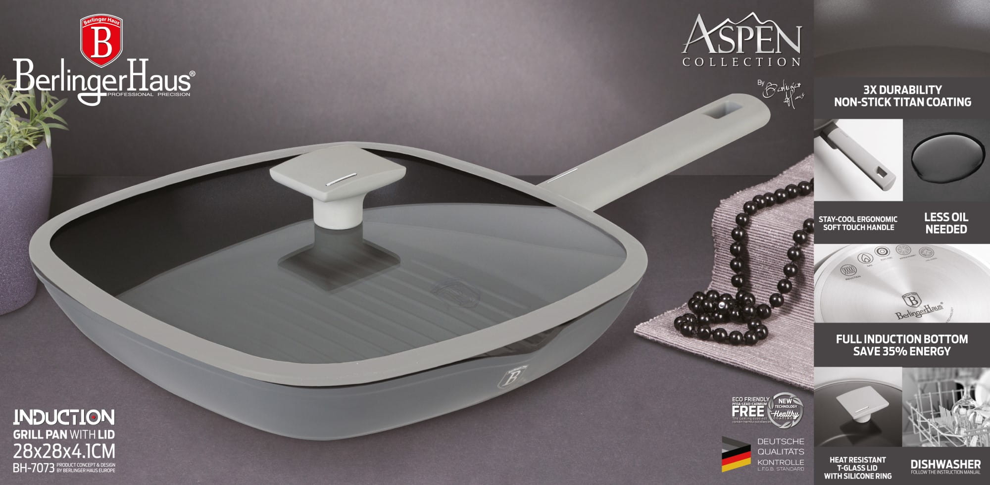 Töpfe und Pfannen ASPEN von BERLINGER HAUS sind aus hochwertigem geschmiedetem Aluminium gefertigt, das innen mit einer dreifachen Titanbeschichtung mit sehr hohem Härtegrad versehen ist. Die Produkte der Serie ASPEN zeichnen sich durch ihre graue Farbe in einem modischen Pastellton und ihren modernen, vollinduktionsfähigen Boden aus. Das attraktive Kochgeschirr ist serienmäßig mit SOFT TOUCH-Griffen ausgestattet. Das Kochgeschirr ist für alle Herdarten geeignet: Gas, Elektro, Keramik, Halogen, Induktion. Das TURBO INDUCTION System (sehr schnelles Aufheizen) ermöglicht eine Energieeinsparung von bis zu 35%.
