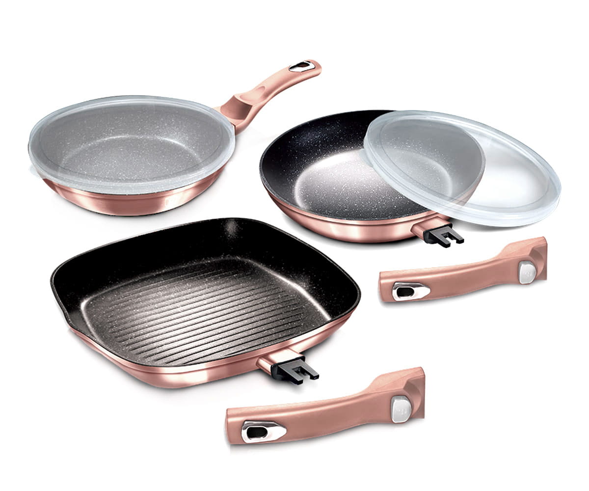5-teiliges Bratpfannenset mit abnehmbaren Griffen von BERLINGER HAUS aus der Serie METALLIC LINE - ROSE GOLD aus hochwertigem geschmiedetem Aluminium mit dreifacher Granitbeschichtung (Marmor) mit sehr hohem Härtekoeffizienten. Die äußere Beschichtung gibt es in mehreren Farbvarianten mit einem charakteristischen Metallic-Glanz. Dieses attraktive und modische Geschirr ist serienmäßig mit SOFT TOUCH (Silikongriff) ausgestattet. Anpassbar an alle Herdarten: Gas, Elektro, Keramik, Halogen, Induktion. Mit dem TURBO INDUCTION System (sie heizen sehr schnell auf) können Sie bis zu 35% Energie sparen.