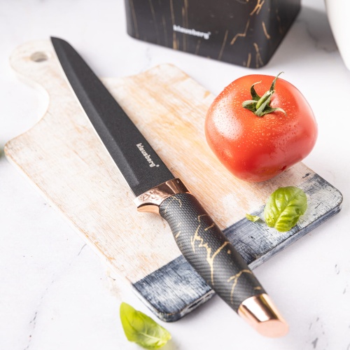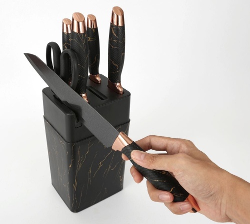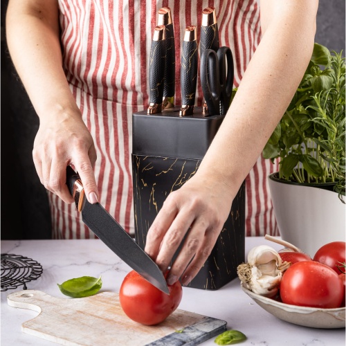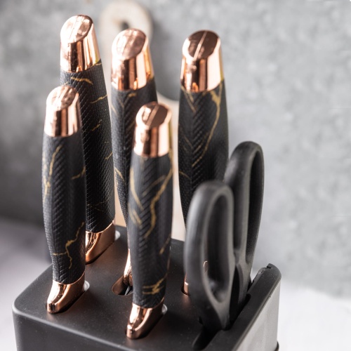 Das marmorierte Muster an den Griffen und dem Halter in Kombination mit weißen Klingen und Verzierungen in Roségold unterstreicht zusätzlich die außergewöhnliche Verarbeitung des Messersets.