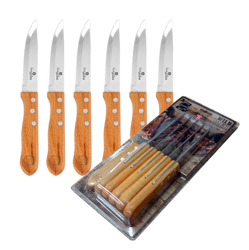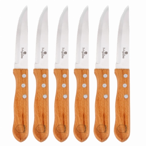 Set aus 6 Steakmessern mit Holzgriffen von BERLINGER HAUS. Die Messer sind aus rostfreiem Stahl und Holz gefertigt.