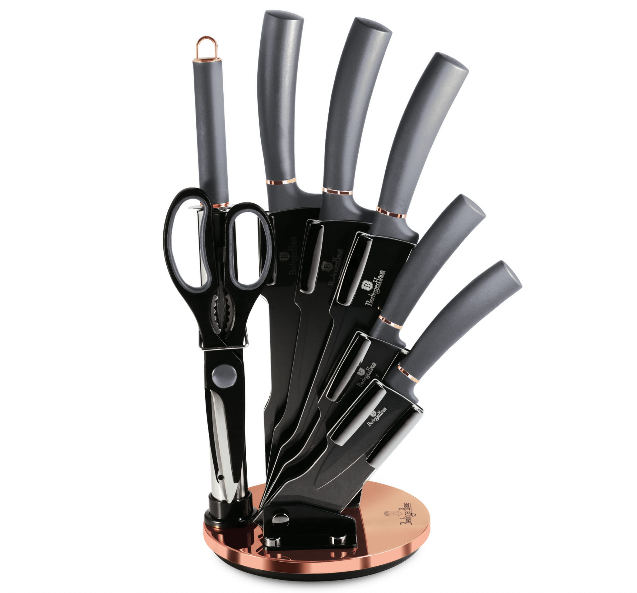 8-teiliges Messerset von BERLINGER HAUS aus der Serie MOONLIGHT auf einem Ständer. Die Edelstahlmesser sind zusätzlich mit einer hochwertigen Antihaftbeschichtung versehen. Ausgestattet mit Griffen, die mit einer sehr haltbaren, dünnen Silikonschicht überzogen sind, um unter allen Bedingungen einen sicheren Halt zu gewährleisten. Alles auf einem drehbaren Ständer aus glänzendem Acryl.