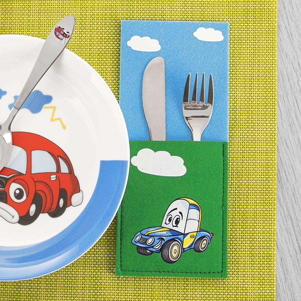 Rechteckiger Besteckkasten aus Filz. Es hat ein Kinderautomotiv. Originelle Tischdekoration. Es wird Kinder dazu ermutigen, selbst zu essen.