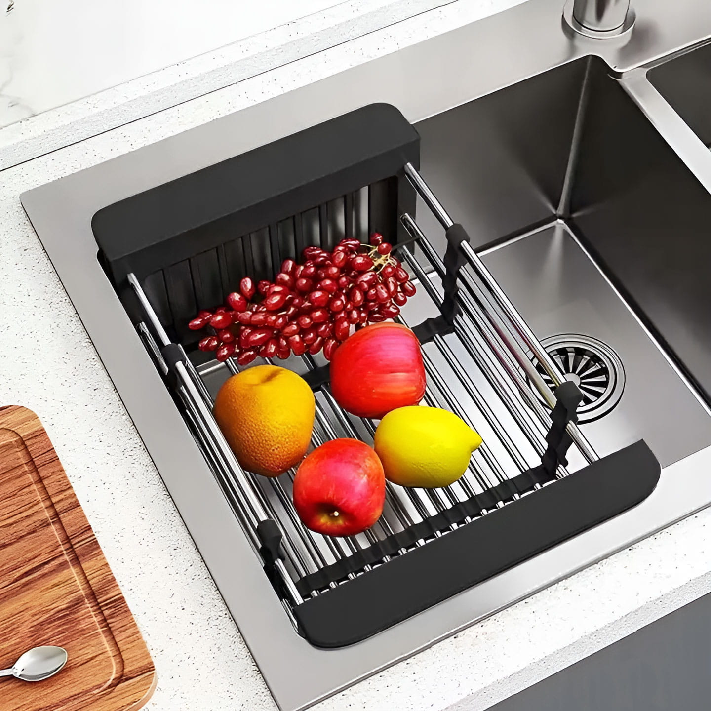 - Anti-Rutsch-Pads: Schützen die Spülenoberfläche und halten die Abtropfschale stabil.