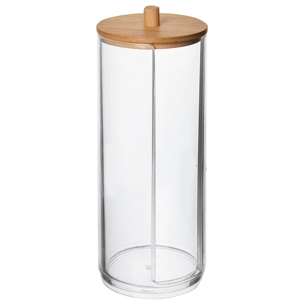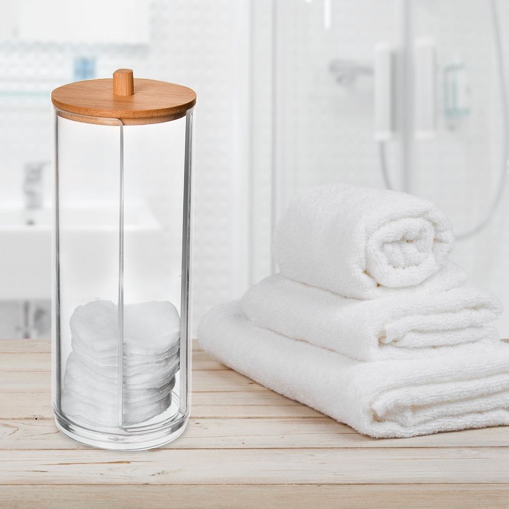 Ein praktischer Behälter für Kosmetikpads. Es hat einen Deckel aus Bambusholz. Es weist im Vergleich zu Einwegverpackungen eine außergewöhnlich attraktive Optik auf.