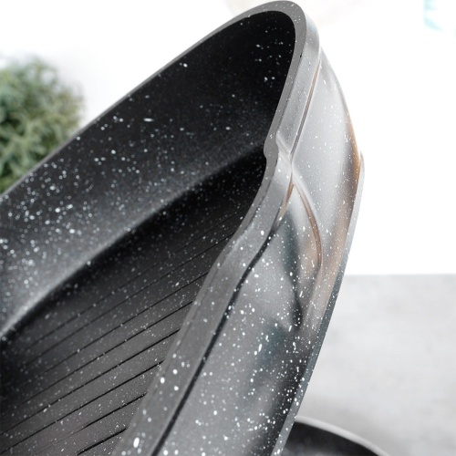 Quadratische Grillpfanne mit Granitbeschichtung. Geeignet für alle Herdarten und spülmaschinenfest.