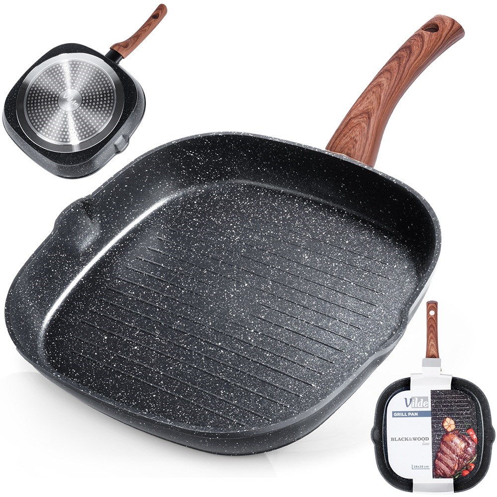 Eine quadratische, antihaftbeschichtete Grillpfanne mit einem einzigartigen, zeitlosen Design. Die Pfanne ist in der modischen Kombination von Schwarz und Holz gehalten und sorgt für ein auffälliges Erscheinungsbild in der Küche. Die Pfanne ist in jeder Küche unverzichtbar. Sie ist aus Materialien höchster Qualität hergestellt. Bei sachgemäßem Gebrauch wird sie viele Jahre halten. Ein Originalprodukt von Vilde aus der Linie Black&Wood. Hergestellt nach den europäischen Normen.