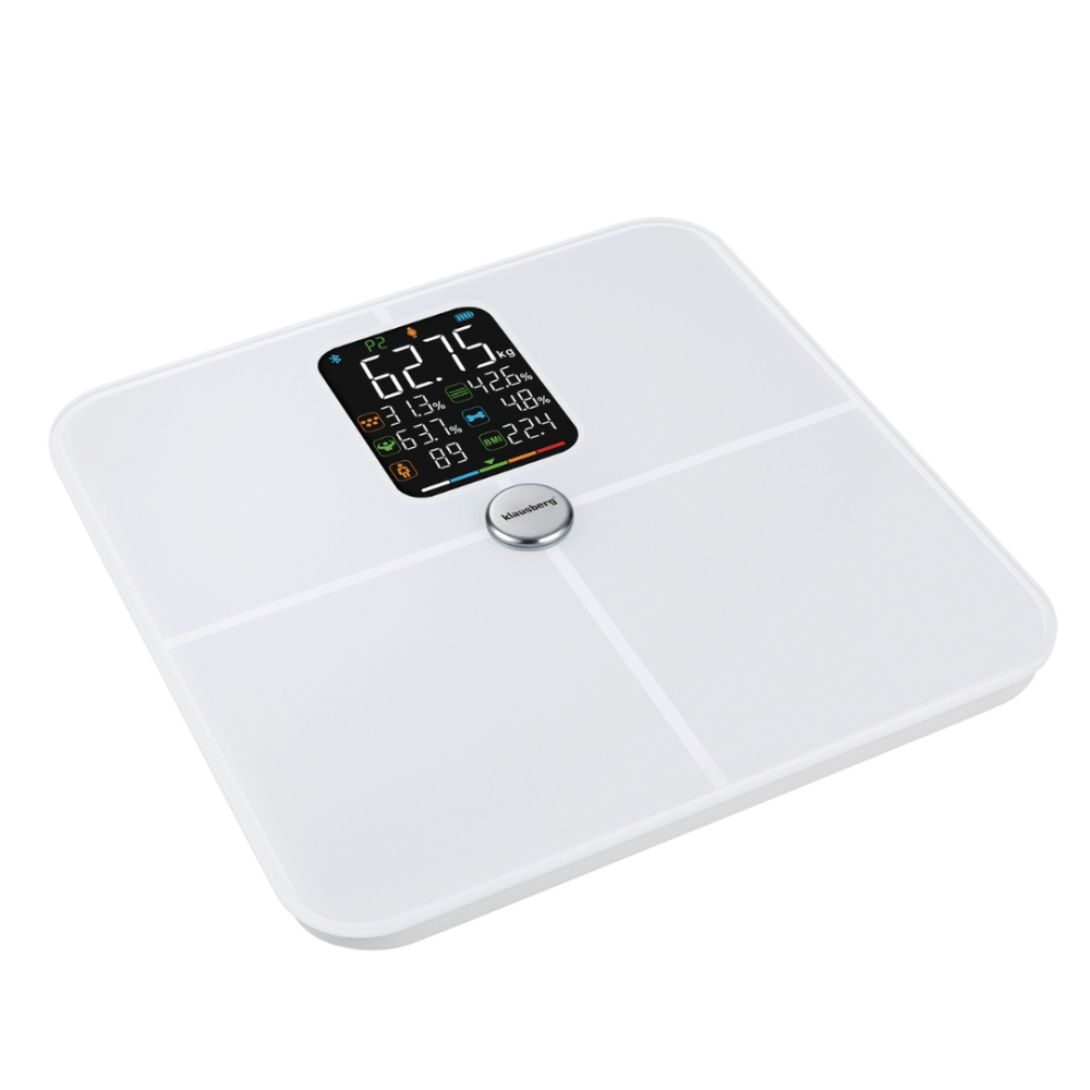 Das minimalistische weiße 28 × 28 cm große Gehäuse aus gehärtetem Glas und das farbige VA-LCD-Display verleihen der Waage das Aussehen eines hochwertigen Geräts, das perfekt in jedes moderne Badezimmer passt.