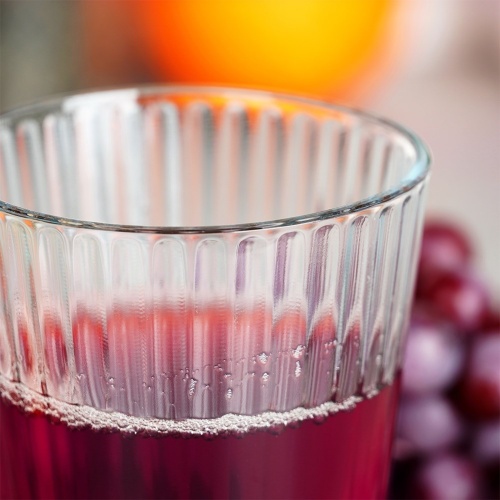 - Glasig- aus dickem Glas in einer transparenten Farbe. Die ideale Transparenz des Glas lässt die Getränke in ihnen effektiv aussehen. Die Brille hat eine spektakuläre vertikale Dekoration.