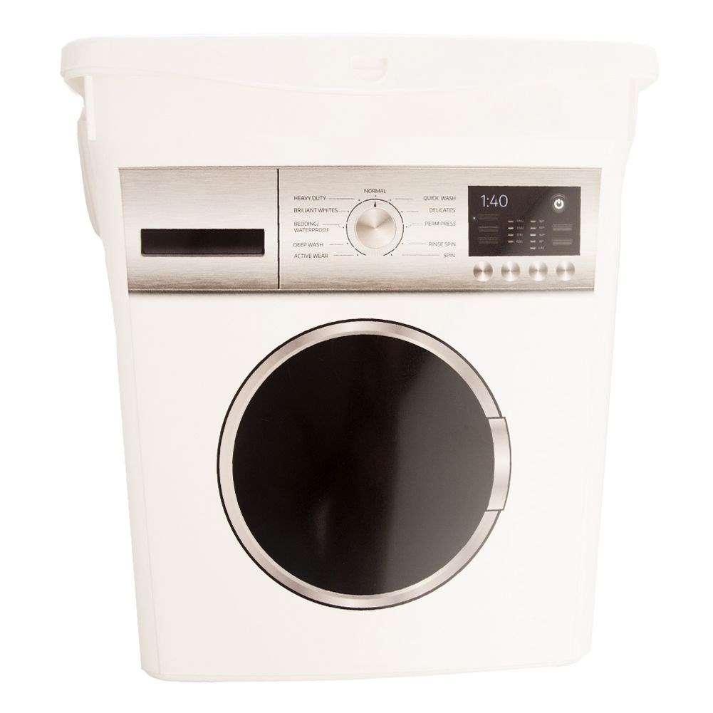 Ein geschlossener Behälter zur Aufbewahrung von Waschpulver, Kapseln, Wäscheklammern und anderen im Badezimmer verwendeten Reinigungsmitteln und Zubehör. Es hat einen Waschmaschinen-Aufdruck.