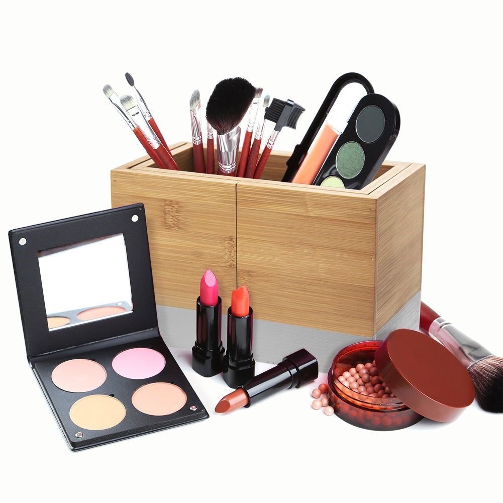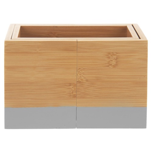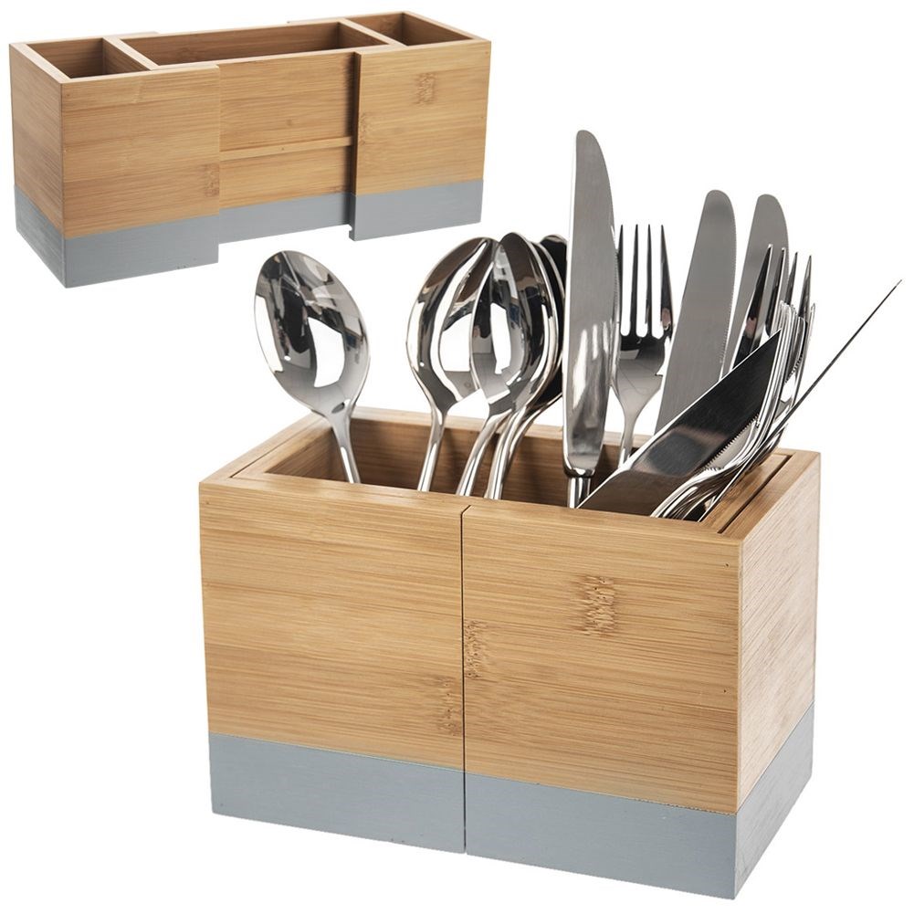 - BAMBUS- Besteck Ständer und Küchenutensilien. Wir können es auch als Organisator verwenden, z. für Make -up -Zubehör. Der untere Teil des Ständers ist aus Bambusholz hergestellt und ist grau gestrichen. Der Behälter hat Abmessungen nach der Entfaltung: 27 x 10 x 12 cm und nach 18,2 x 10 x 12 cm.