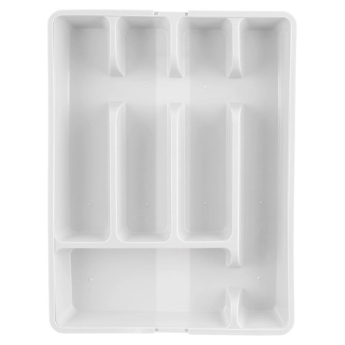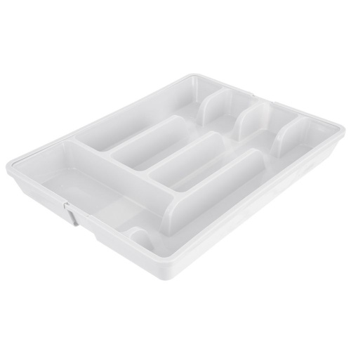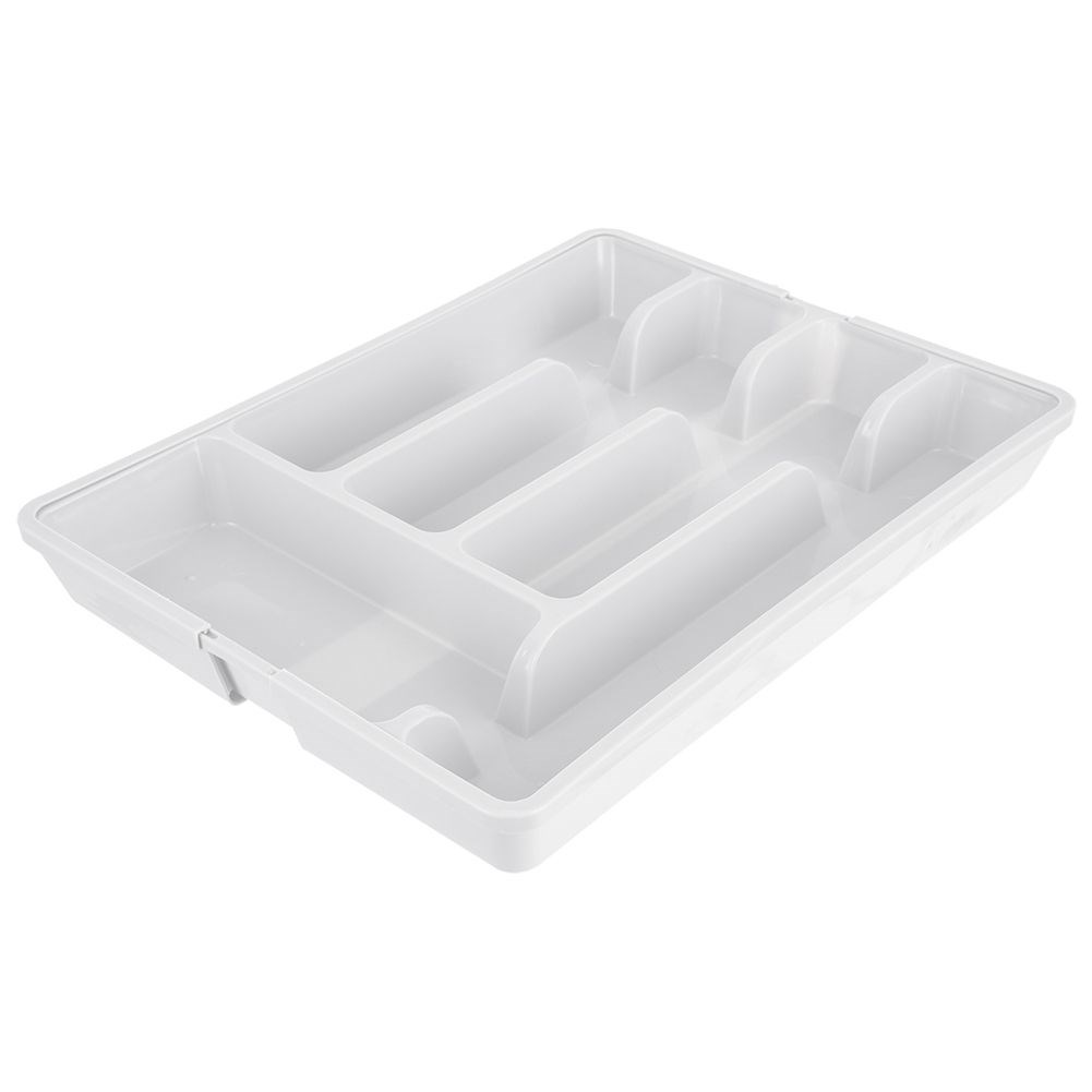 Verstellbarer Organisator für Besteck- und Küchenutensilien für die Schublade. Aus Kunststoff in Weiß gemacht. Abhängig von der Einstellung verfügt es über 5 bis 7 Fächer.