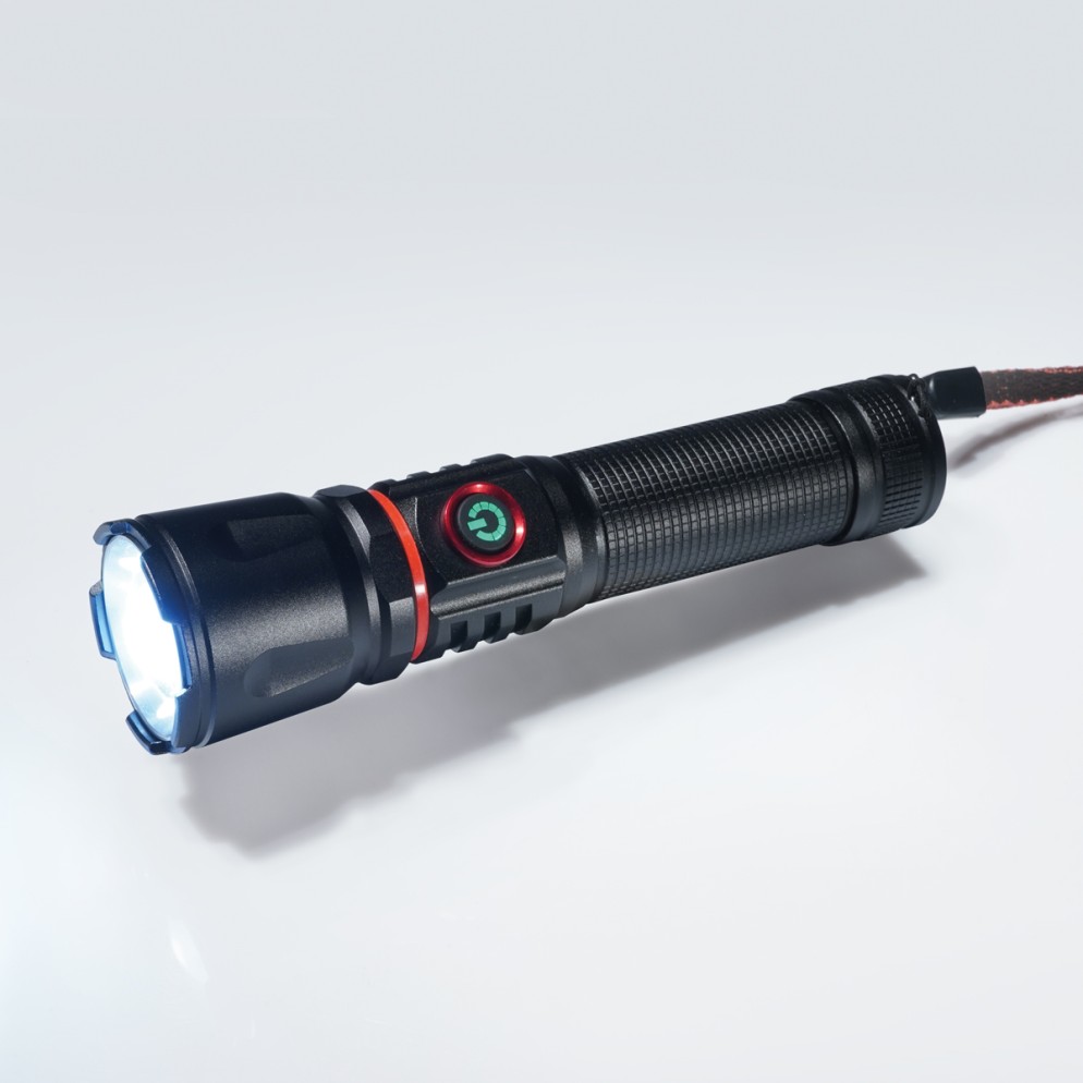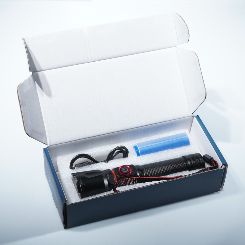 Eine effiziente Taschenlampe, ausgestattet mit einer P60-Glühbirne mit einer Leistung von 800 Lumen und einer COB-Glühbirne mit einer Leistung von 300 Lumen, mit drei Beleuchtungsmodi und einer Zoomfunktion.