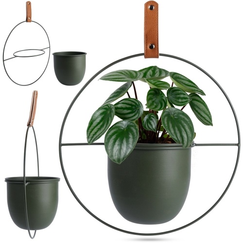 An einem Lederanhänger hing ein Blumentopfdeckel. Es hat ein modisches Design und sieht daher sehr eindrucksvoll aus, egal wo es aufgehängt wird. Wir können darin Blumen aufbewahren, aber auch Kräuter sehen darin genauso schön aus. Die grüne Farbe passt gut zu den Grünpflanzen. Entworfen im industriellen Loft-Stil. Eine originelle Geschenkidee für Pflanzenliebhaber.Ein Originalprodukt der niederländischen Marke Home Styling Collection.Hergestellt nach europäischen Standards.