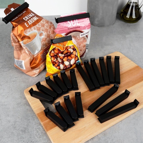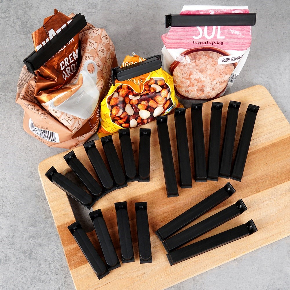 Set mit 22 Beutelverschlussklammern in zwei Größen. Dank ihnen bleiben Lebensmittel frisch und dicht verschlossen.