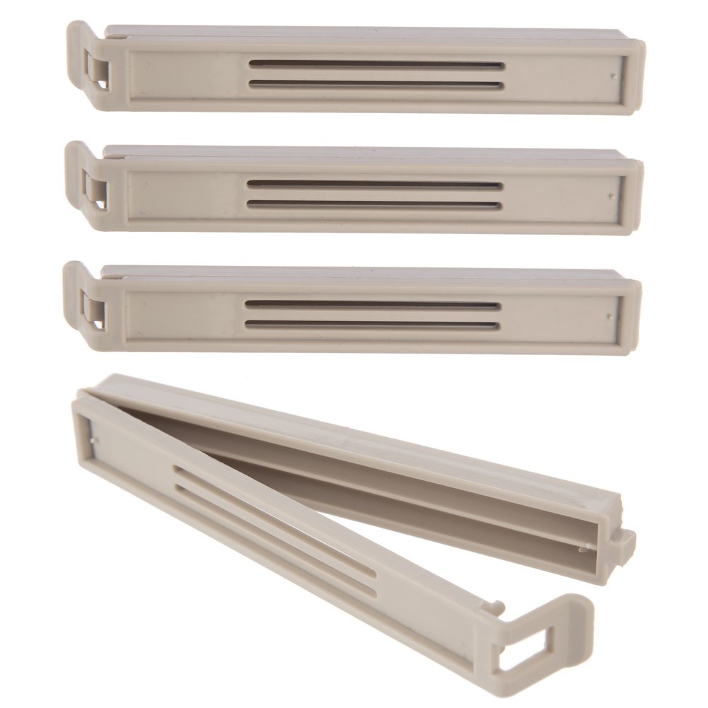 - Set mit 4 Taschenklammern- Ein Set aus vier Kunststoffklammern, ideal zum festen Verschließen von Lebensmittelbeuteln, damit die Produkte länger frisch bleiben. Die Clips haben die Maße: 11 x 1,5 cm.