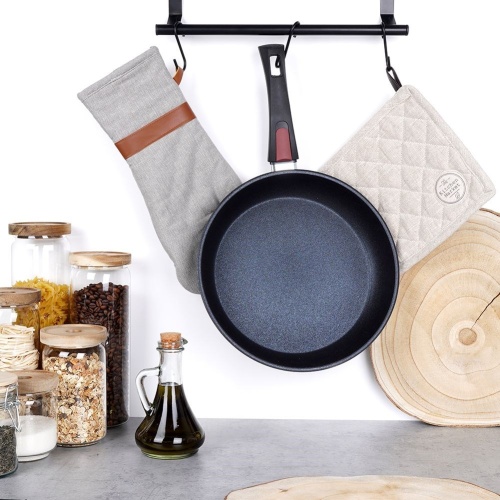 Antihaftbeschichtete Bratpfanne mit abnehmbarem Griff in einem einzigartigen, zeitlosen Design. Die Bratpfanne ist in jeder Küche unverzichtbar. Sie kann zum Braten von Fleisch, Gemüse und Pfannkuchen verwendet werden. Die Pfanne ist resistent gegen chemische Korrosion, die durch Reinigungsmittel verursacht wird. Ein Originalprodukt der tschechischen Marke Orion. Hergestellt in Übereinstimmung mit den europäischen Normen.