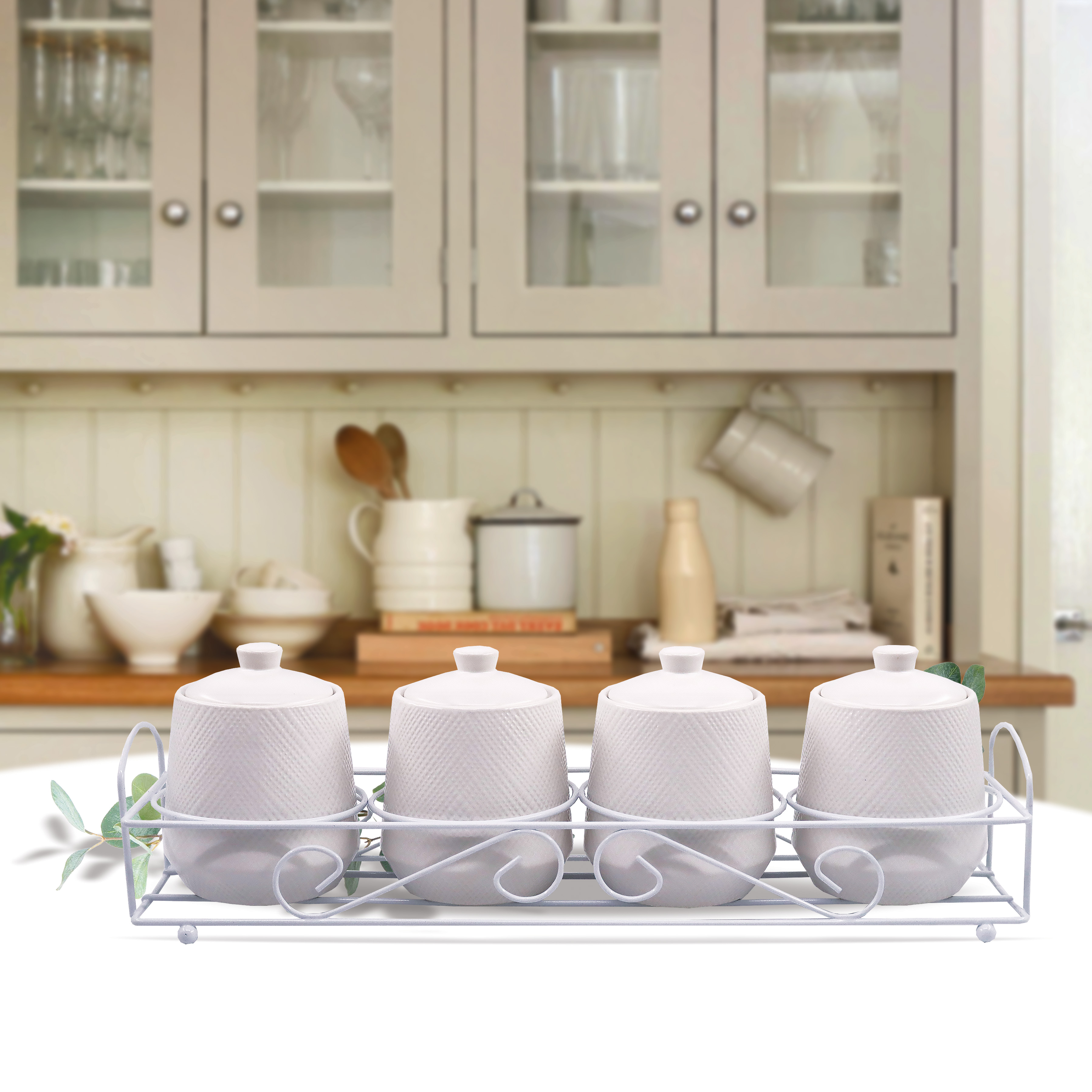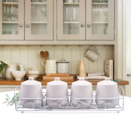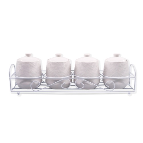 Wir präsentieren praktische und stilvolleEin Satz Keramikbehälter für Spice Maestro- Eine ideale Lösung für Menschen, die Ästhetik, Haltbarkeit und Komfort des Gebrauchs schätzen. Das Set besteht aus4 Behälter aus hochwertiger Keramikund stabilMetallregal, was die Organisation in der Küche erleichtert.