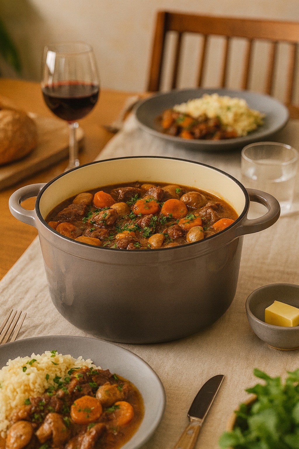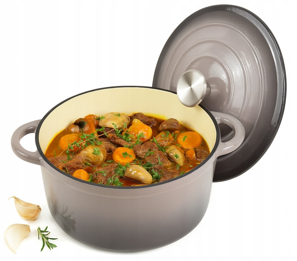 Äußerst robuster, emaillierter Gusseisentopf. Er speichert die Wärme perfekt und verteilt sie gleichmäßig, ideal zum Kochen, Schmoren und Backen.
