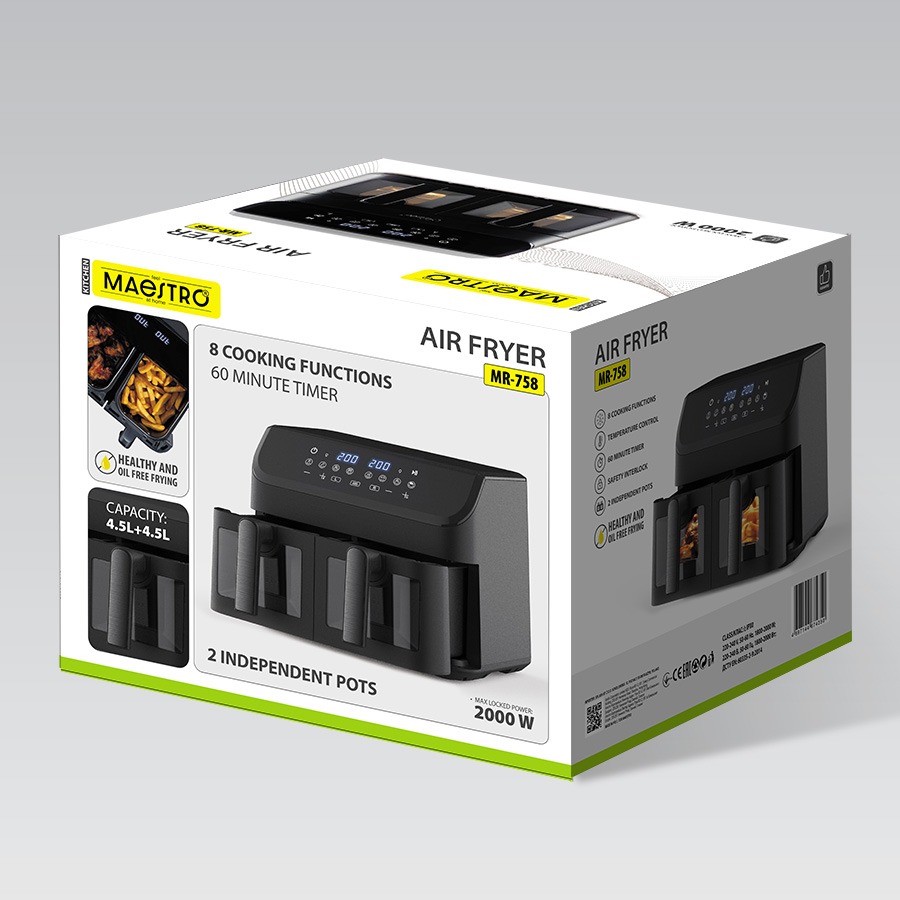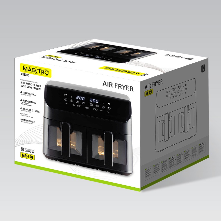 Die Heißluftfritteuse MAESTRO ermöglicht knusprige Ergebnisse mit deutlich weniger Fett. Das Gerät arbeitet mit heißer Luftzirkulation und eignet sich ideal für Pommes, Fleisch, Gemüse und Snacks.