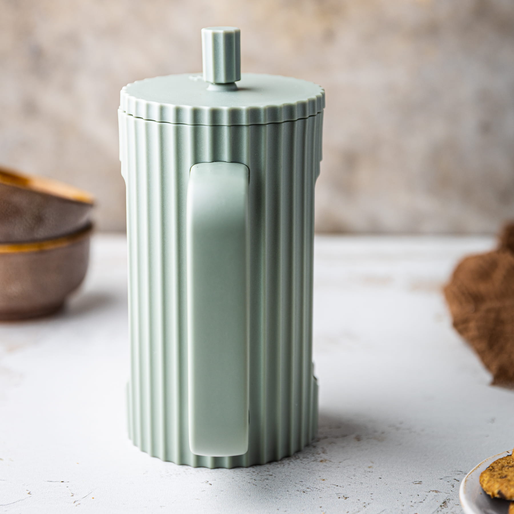 - Das äußere Gehäuse besteht aus hochwertigem Kunststoff mit einer geriffelten Oberfläche, die zusätzlich die Temperatur des aufgebrühten Getränks isoliert.