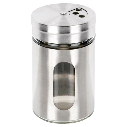 Ein Gewürzbehälter mit einem Spender speichert und dosierte Gewürze. Aus Glas und Edelstahl. Es hat drei Dosierungsstufen.