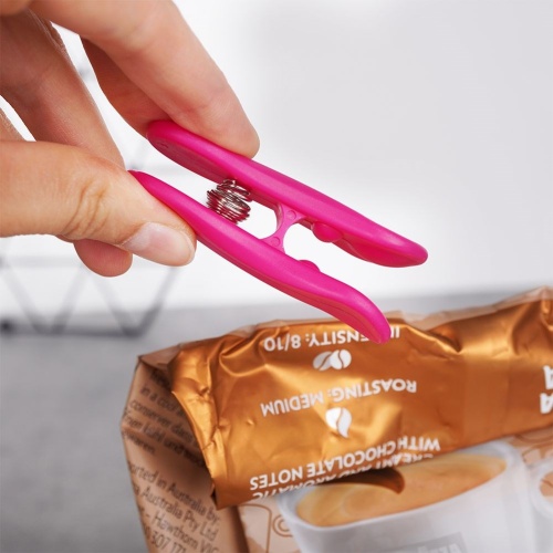 Ein Set mit sechs bunten Verpackungsklammern. Mit Clips können Sie Lebensmittelbeutel fest verschließen. Äußerst nützlich in jeder Küche.