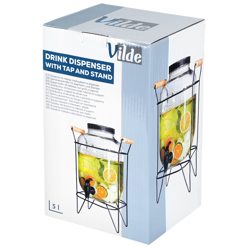 Ein Satz, der aus einem Glas mit einem Wasserhahn und einem Glasstand besteht. Ideal zum Servieren von Wasser, Limonade, Saft, gefrorenem Tee, aromatisiertem Wasser, aber auch Punch. Dank des Fassungen können wir Ihre Lieblingsgetränke auf effektive Weise problemlos servieren. Wir werden das Glas mit einem Stand sowohl im Garten als auch während der Familienversammlungen verwenden. Dank der geschlossenen Abdeckung werden keine Insekten in unser Getränk einsteigen. Es besteht aus Materialien, die für Gesundheit und Neutral für Lebensmittel sicher sind. Nicht geeignet für heiße Getränke. Aufmerksamkeit! Die Verpackung enthält falsche Informationen zur Kapazität, die tatsächliche Kapazität steht im Einklang mit der obigen Beschreibung.Originales VILDE -Produkt.Nach europäischen Standards hergestellt.