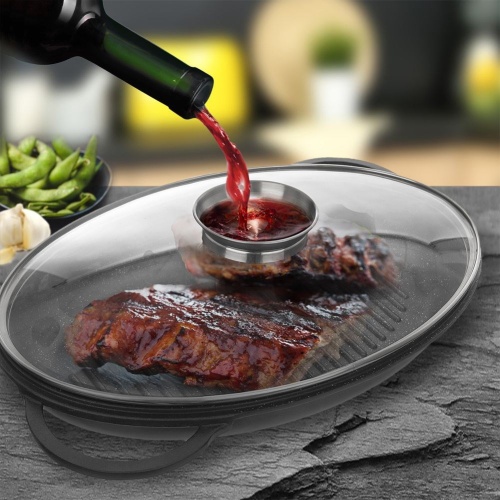 - PRAKTISCH- Grillpfanne mit den Gesamtmaßen 43 x 28 x 10 cm mit Deckel. Die Innenmaße der Pfanne betragen 38 x 25 x 5 cm. Die Form kann als Bratpfanne mit Grillboden oder als Bratpfanne zum Backen im Ofen verwendet werden. Der Deckel ist mit einem Spender ausgestattet, durch den wir flüssige Gewürze oder Wein ausgeben können.
