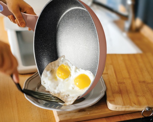 Kochen auf der Granitbeschichtung hat einen sehr grossen Einfluss auf den Geschmack von Lebensmitteln. Die Folie erwärmt sich sehr schnell , die die Wand der Nahrungsmittel „schließt“ (Fleisch, Fisch ...), die Mineralien , Vitamine und natürliche Säfte innen. Braten braucht eine minimale Fettmenge oder Wasser. Der Boden speichert perfekt die Wärme und spart die Energie.