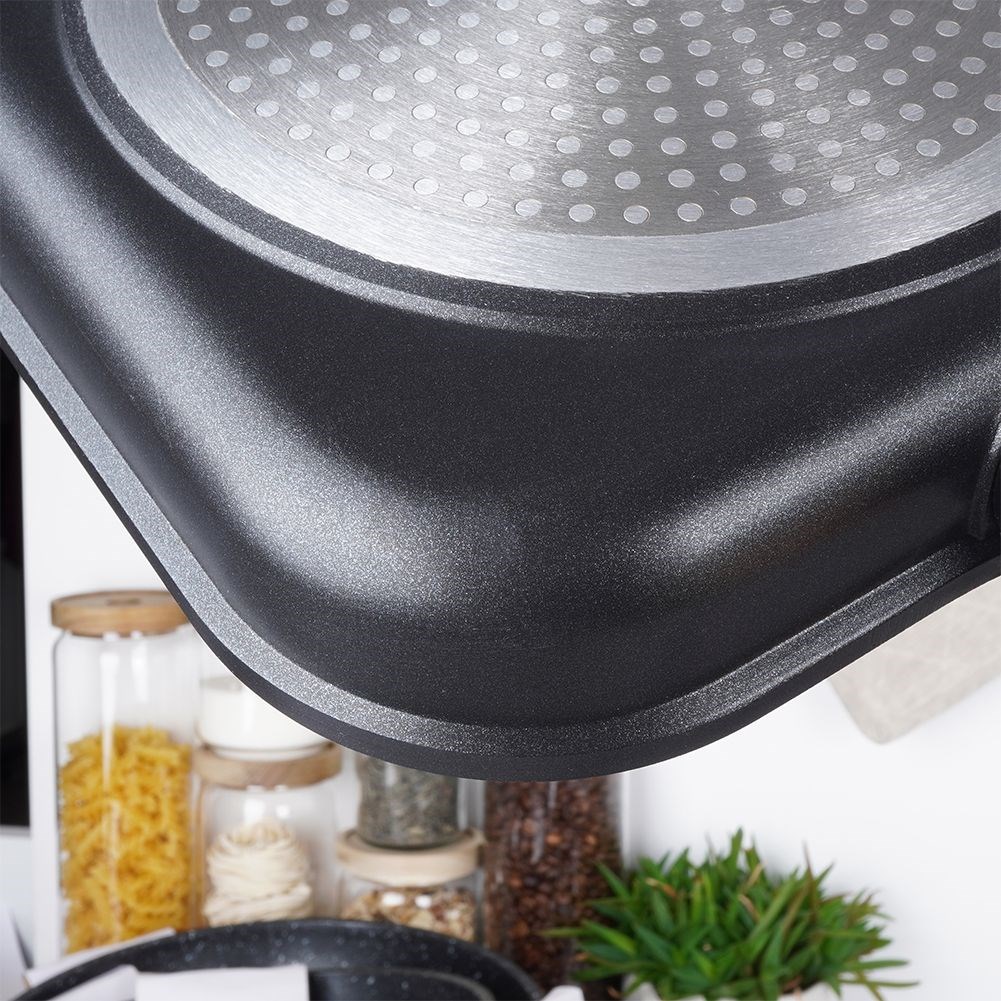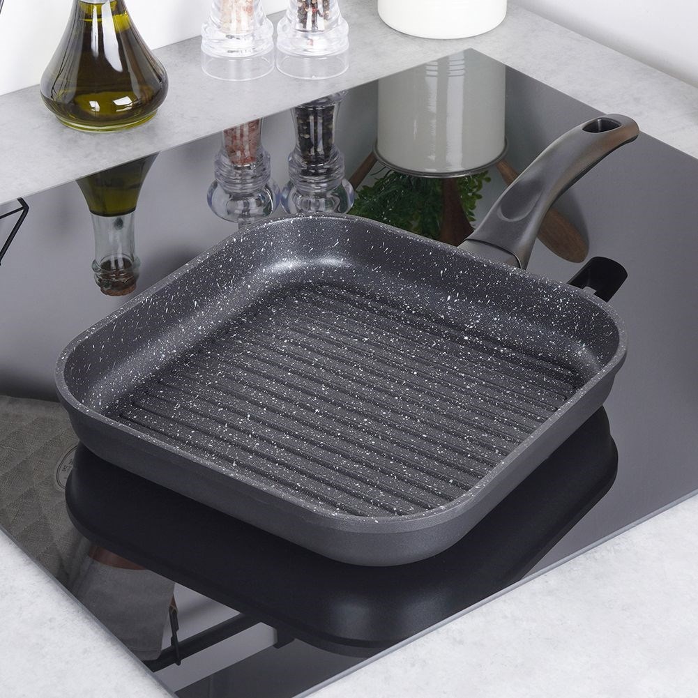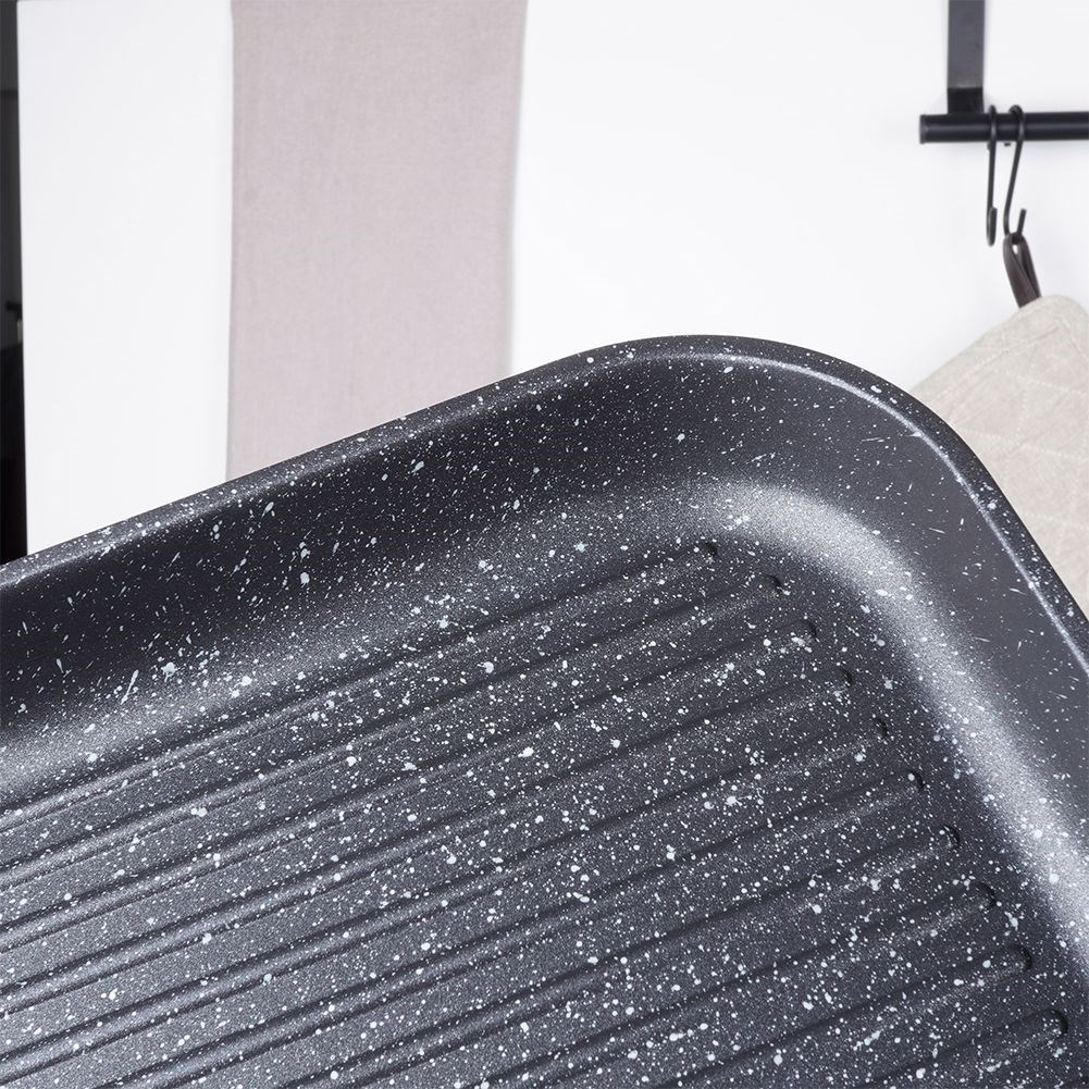Quadratische Grillpfanne mit Antihaftbeschichtung aus Granit. Passend für alle Herdarten und spülmaschinenfest.