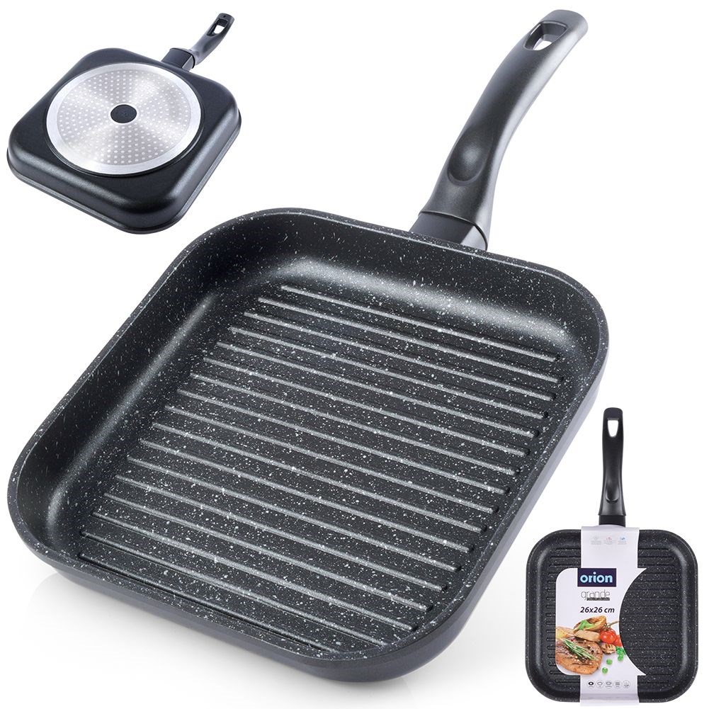 Eine quadratische, antihaftbeschichtete Grillpfanne mit einem einzigartigen, zeitlosen Design. Die Pfanne ist in jeder Küche unverzichtbar. Mit ihrer Hilfe können Sie gegrilltes Fleisch, Gemüse und Kartoffeln zubereiten. Hervorragend geeignet zum Braten von Burgern. Sie ist aus hochwertigen Materialien hergestellt. Bei sachgemäßem Gebrauch hält sie viele Jahre lang. Wir bieten auch anderes Geschirr aus der Serie GRANDE an. Originalprodukt der tschechischen Marke Orion. Hergestellt in Übereinstimmung mit den europäischen Normen.