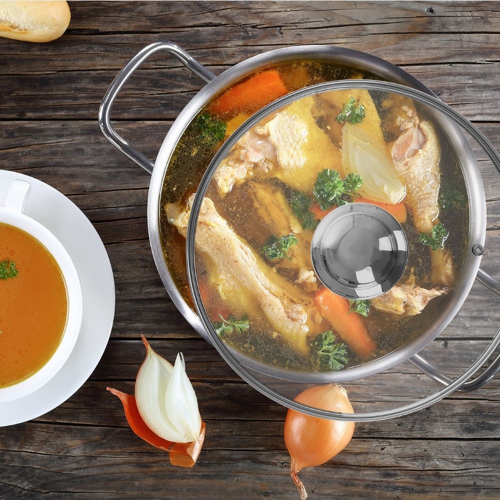 Hitzebeständiger konvexer Glasdeckel mit Stahlrand und Rand. Es ist mit einem speziellen Loch ausgestattet, durch das überschüssiger Dampf abgelassen werden kann.