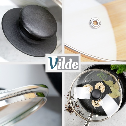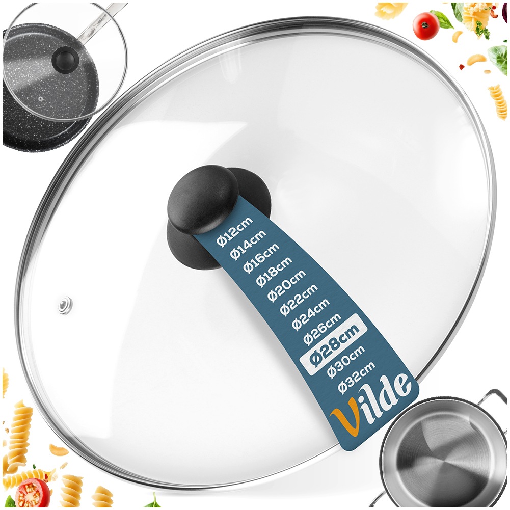 Universeller Glasdeckel, perfekt für Geschirr, Pfannen und Töpfe mit einem Durchmesser von 28 cm. Hergestellt aus langlebigen und soliden Materialien. Es ist eine tolle Ergänzung zu einem Topf oder einer Pfanne, die keinen Deckel im Set hat. Die klassische Form sorgt für eine komfortable Nutzung. Ein Deckel ist in jeder Küche unverzichtbar. Dadurch gart das Essen schneller und schützt vor Wasser- und Fettspritzern. Darüber hinaus sorgt der Deckel dafür, dass zubereitete Speisen länger heiß bleiben.Original Vilde-Produkt.Hergestellt nach europäischen Standards.