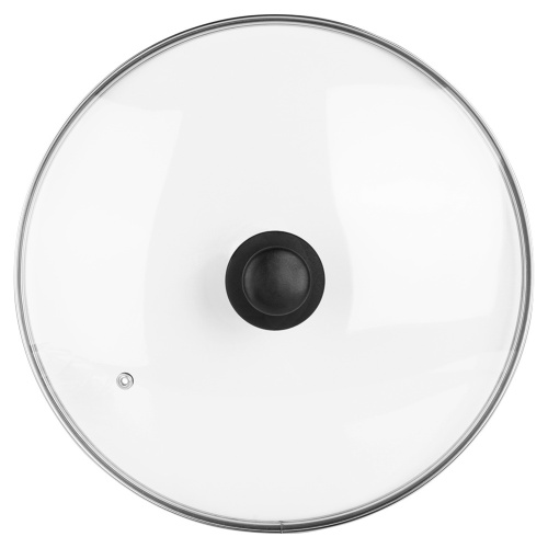 Glas, gewölbte Abdeckung mit Stahlrand und Rand. Es verfügt über einen bequemen Kunststoffgriff. Es ist mit einem speziellen Loch ausgestattet, durch das überschüssiger Dampf abgelassen werden kann.