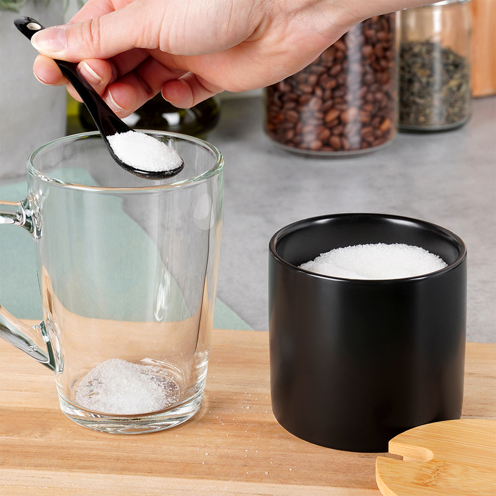- Aus Keramik und Bambus- Die Zuckerschale und der Teelöffel bestehen aus der höchsten Keramik in einer eleganten schwarzen Farbe. Deckel aus Bambusholz. Ordnungsgemäß verwendet werden viele Jahre dienen.