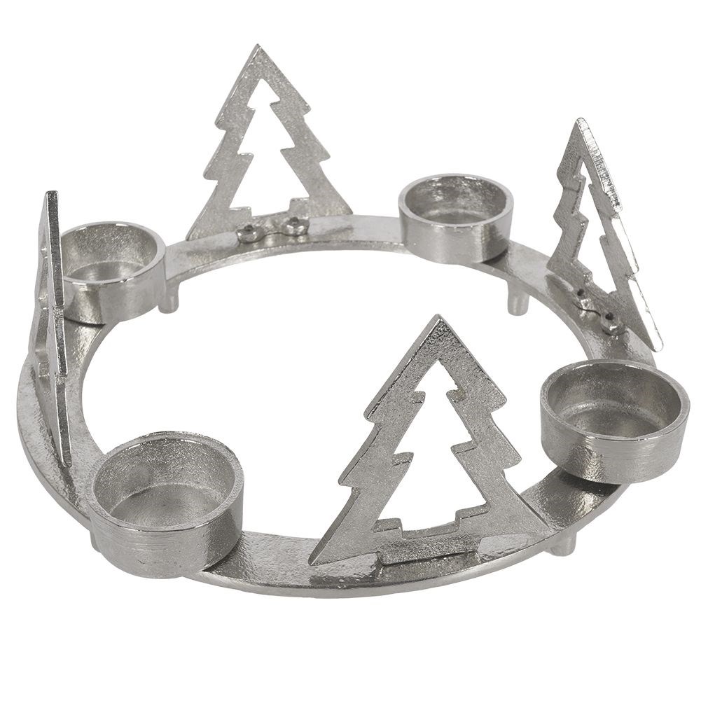 Kerzenhalter für vier Teelichter oder Kerzen. Aus silbernem Aluminium. Es hat wunderschöne Dekorationen in Form von vier Weihnachtsbäumen. Perfekt für die Ferienzeit.