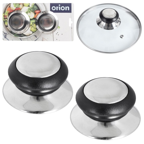 Set bestehend aus zwei Ersatzdeckelhaltern mit Schrauben. Hergestellt aus Edelstahl und Kunststoff. Knöpfe passend für Deckel mit einem Durchmesser von 14 bis 30 cm.