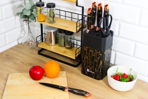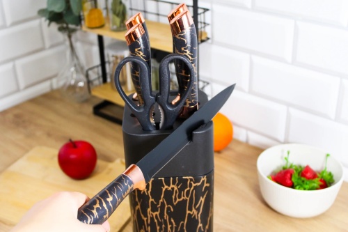Das Set ist eleganteine Kombination aus schwarzen und goldenen Akzenten, was ihm einen luxuriösen Charakter verleiht. Der mitgelieferte Ständer sorgt nicht nur für Ordnung in der Küche, sondern schmückt auch die Arbeitsplatte. Dank des durchdachten Designs und der kompakten Abmessungen sind die Messer immer griffbereit und einsatzbereit. EingebautSpitzer im Blockermöglicht es Ihnen, Ihre Messer ganz einfach in einwandfreiem Zustand zu halten.