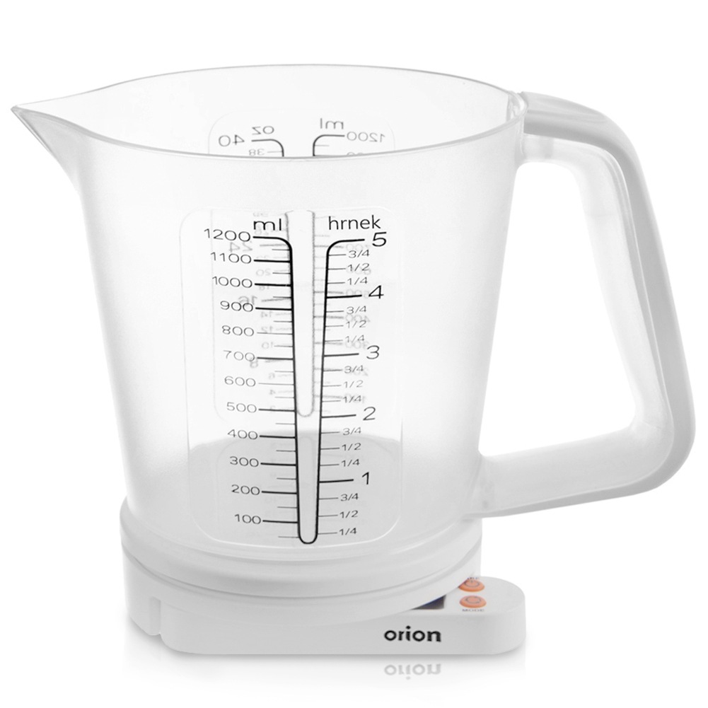 Küchenwaage mit Digitalanzeige und einem Messbecher in einem Krug. Die Waage hat ein modisches Design und sieht sehr elegant aus. Nützlich in jeder Küche. Damit können Sie sowohl lose als auch flüssige Zutaten richtig abmessen. Die Waage ist auch für Menschen nützlich, die die Menge der von ihnen konsumierten Produkte kontrollieren möchten. Die Waage ist für den Heimgebrauch bestimmt.Originalprodukt der tschechischen Marke Orion.Hergestellt nach europäischen Standards.