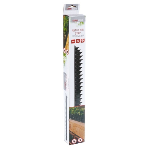 Auf 10 Lamellen platzierte Vogelspikes. Jeder Streifen hat 99 Stacheln und ist 50 cm lang. Die Streifen können zu einer Länge von 5 Metern verbunden werden. Spitzenhöhe 2 cm.