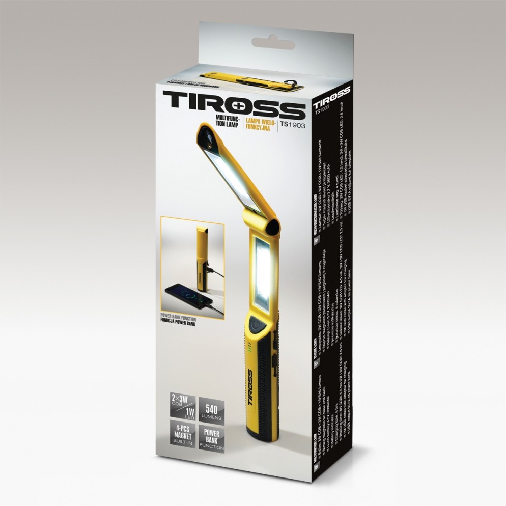 TS1903 Werkstattlampe. Die Lampe ist mit zwei effizienten Leuchtmitteln ausgestattet – COB-LED und klassischer LED, die insgesamt helles Licht mit einer Leistung von 540 Lumen abgeben.