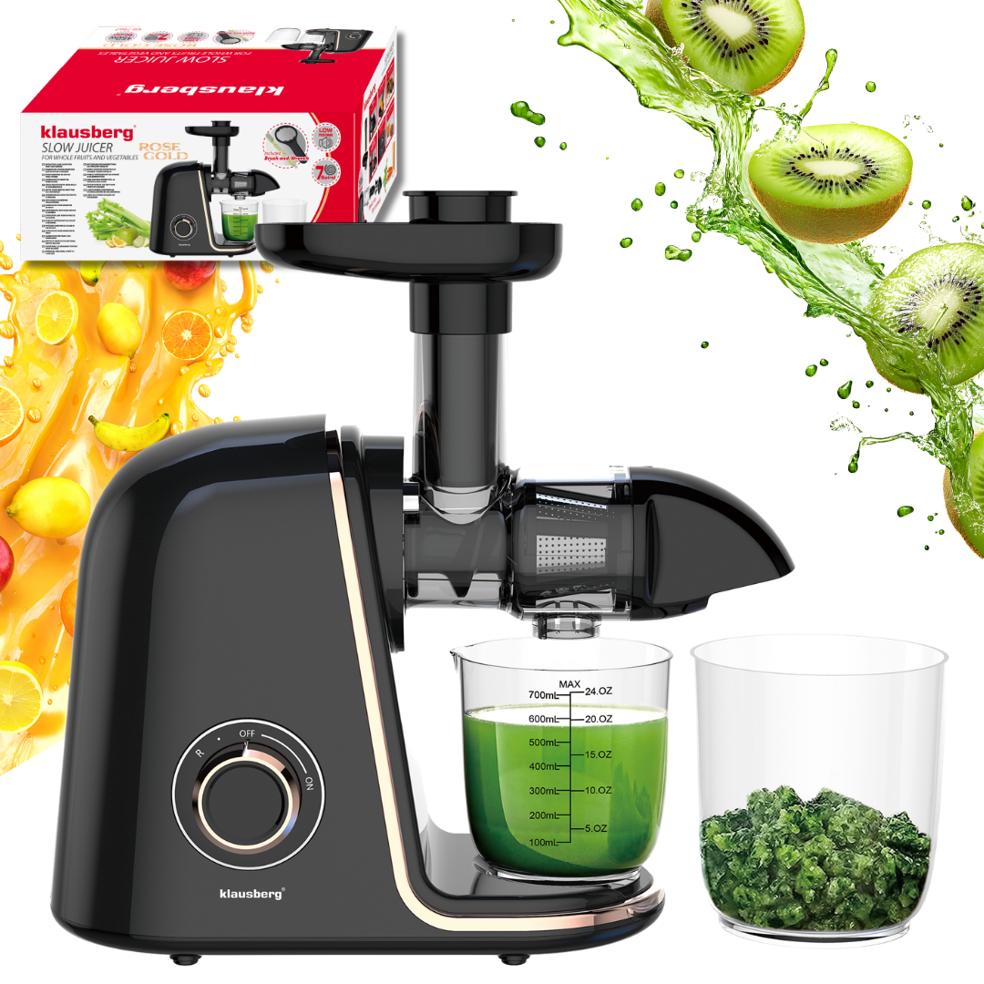 Langsam entsaftender Entsafter der Marke KLAUSBERG in schwarzer Farbe mit Akzenten in Roségold