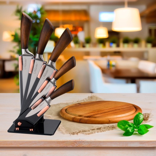 Praktisches 6-teiliges Messerset mit Standfuß für den täglichen Einsatz in der Küche. Die Messer bestehen aus hochwertigem Edelstahl und liegen dank ihrer ergonomischen Griffe angenehm in der Hand.