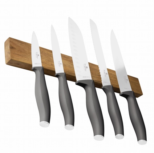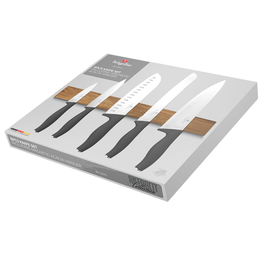 Messerset mit Magnetstreifen 6 Elemente von BERLINGER HAUS aus der Serie Antracit. Messer aus scharfem Edelstahl. Ausgestattet mit Griffen, die mit einer sehr widerstandsfähigen dünnen Silikonschicht überzogen sind, für einen sicheren Halt unter allen Bedingungen.