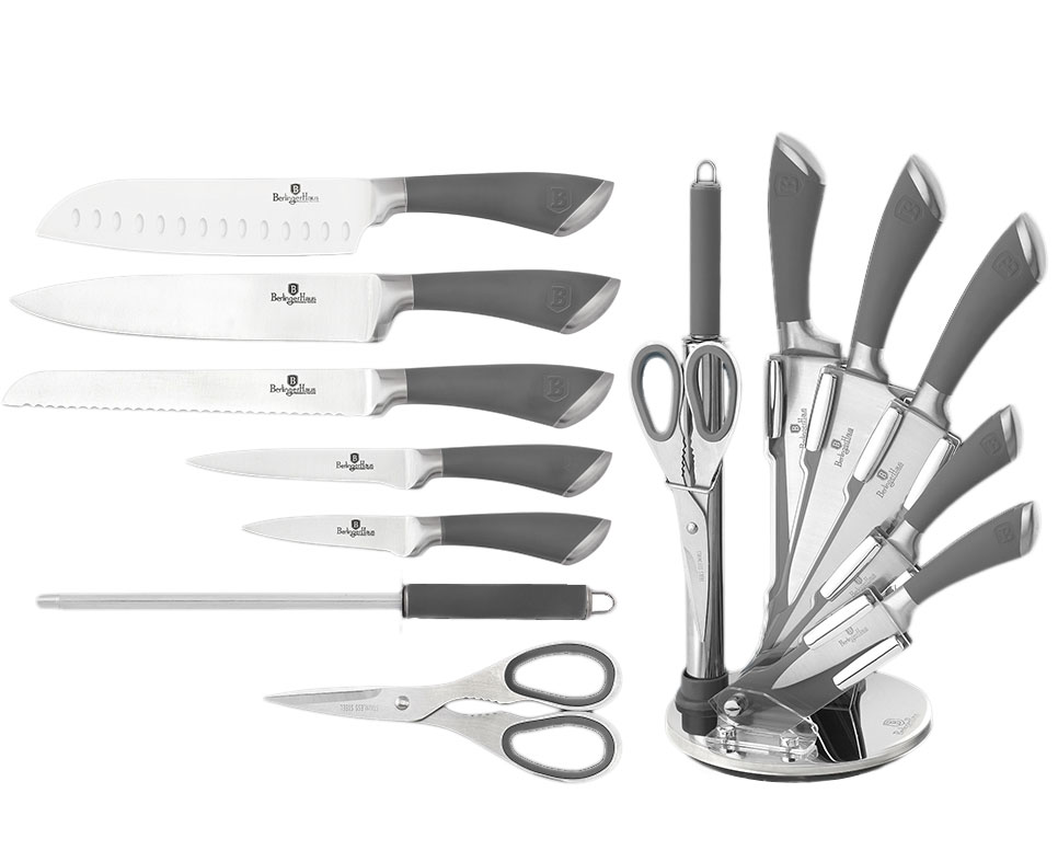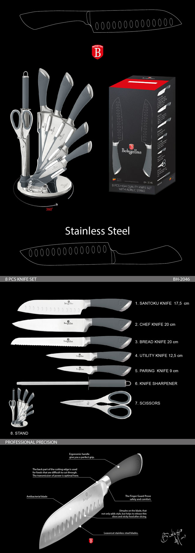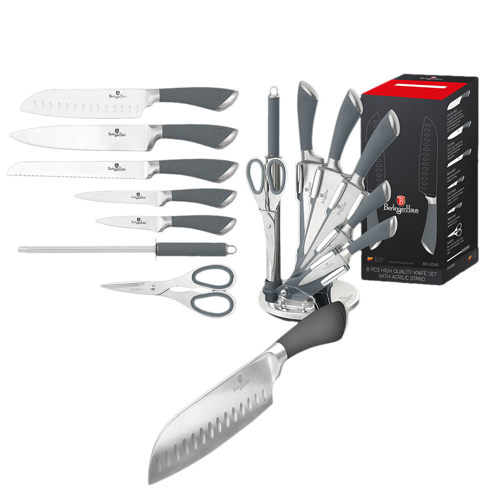 8 elementowy zestaw noży na stojaku firmy BERLINGER HAUS z serii INFINITY. Komplety zestaw ogólnego przeznaczenia. Przeznaczone do porcjowania mięsa i ryb, krojenia pieczywa oraz siekania warzyw. Noże wykonane z wysokogatunkowej nierdzewnej stali japońskiej. Masywne, z okładziną kauczukową w kolorze szarym.