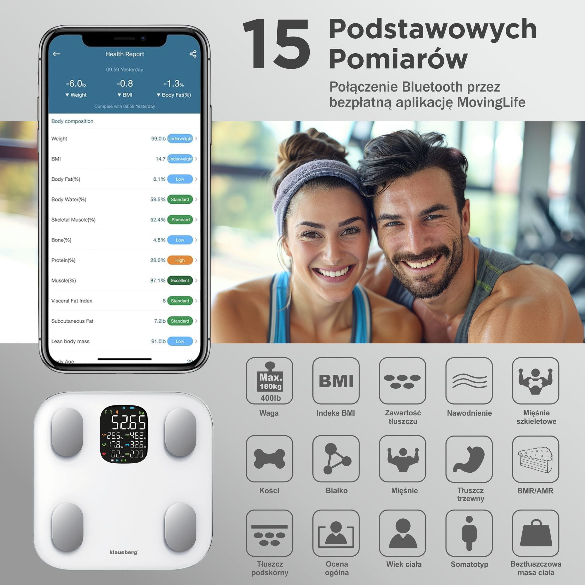 Mit ihren fortschrittlichen Funktionen und der Möglichkeit, eine Vielzahl von Parametern zu überwachen, wird die Waage KLAUSBERG KB-7855 zu einem unverzichtbaren Werkzeug für einen gesunden Lebensstil. Robuste Verarbeitung und modernes Design in Weiß machen sie zu einem perfekten Element für jedes Interieur. Vertrauen Sie der Marke KLAUSBERG und genießen Sie Produkte von höchster Qualität, die Ihre Gesundheit und Ihr Wohlbefinden unterstützen. Wählen Sie KB-7855 – die Waage, die Ihnen umfassende Informationen über Ihren Körper liefert und Ihnen hilft, Ihre Gesundheitsziele zu erreichen.