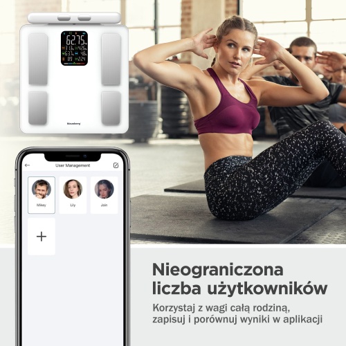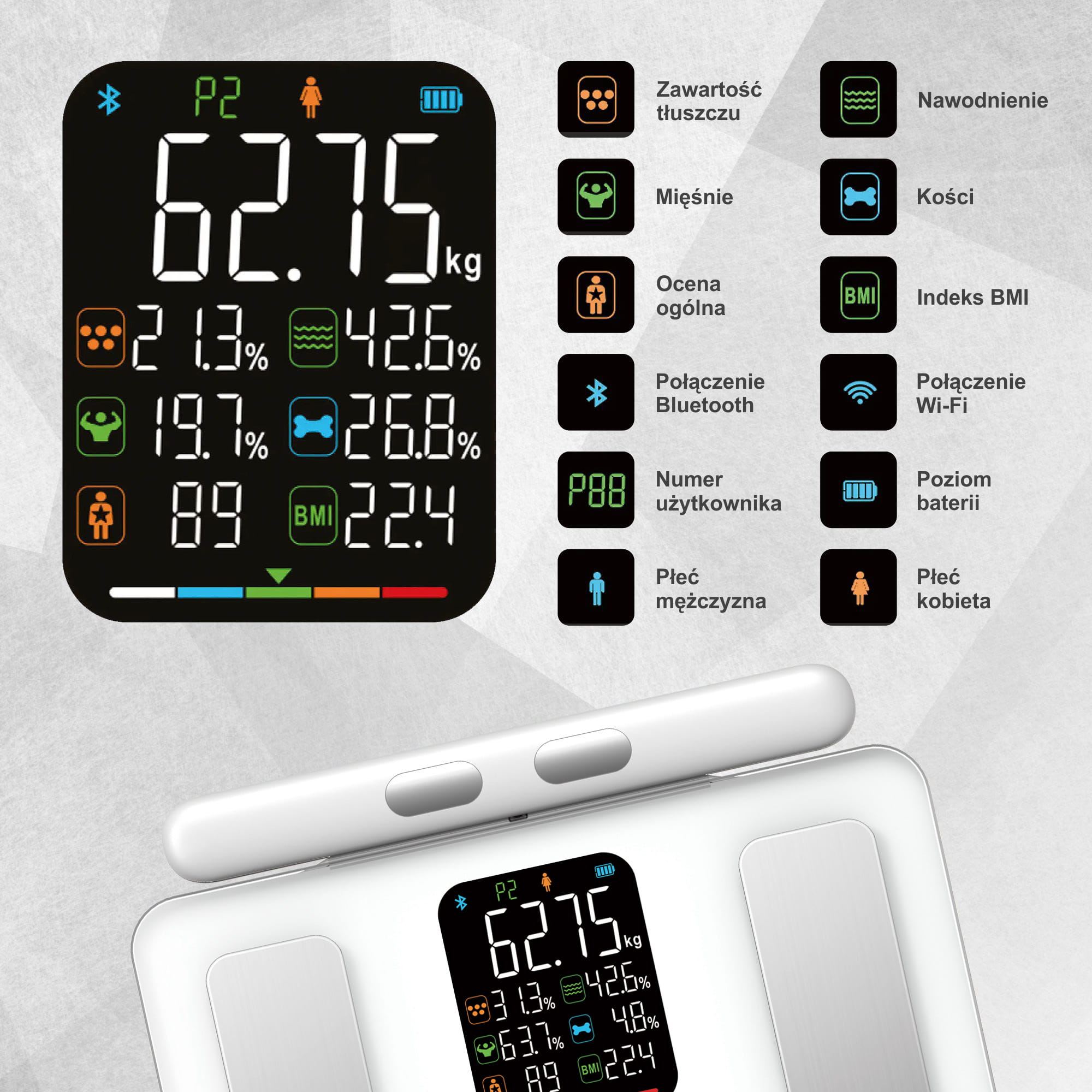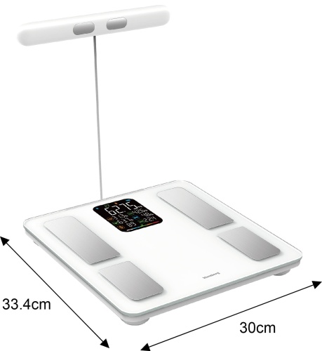 - Sie ermöglicht Messungen von Parametern wie Körpergewicht, BMI, Körperfettanteil, Hydratationsniveau, Skelettmuskeln, Knochenmasse, Proteinspiegel, viszeralem Fett, subkutanem Fett, fettfreier Körpermasse, metabolischem Alter, BMR/AMR und Körpertyp.