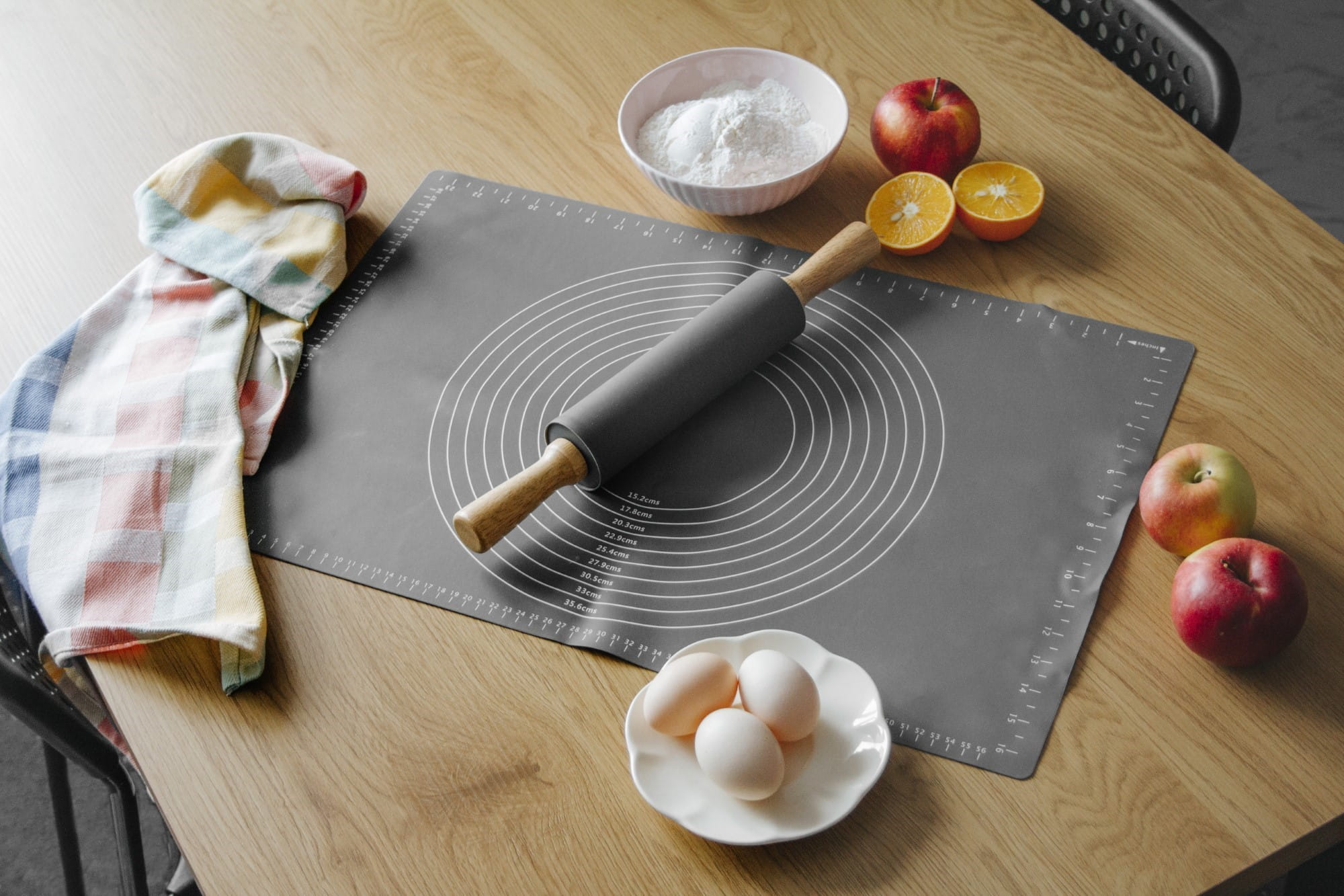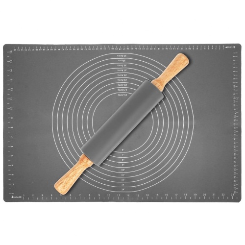 Um die Arbeit in der Küche zu erleichtern und zu beschleunigen, ist die Matte mit einem Messbecher und verschieden großen Kreisen ausgestattet, die dabei helfen, einen Teigkuchen mit dem entsprechenden Durchmesser zu kneten.